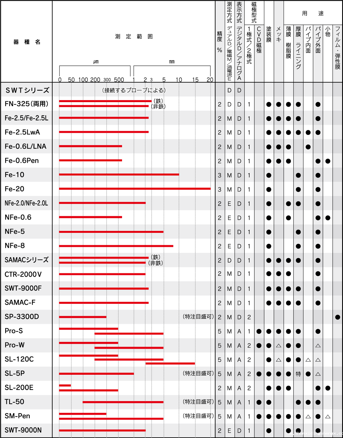 上述膜厚仪为两点调整式膜厚仪,进行调零和标准调整,符合各政府机关及各公司内部规定。 [查看膜厚仪列表] 测量范围 有 1 量程型和 2 到 3 量程型。 可定制订单 我们还可以通过定制订单制造标准测量范围以外的范围。 准确性 平均值的指定值的 ±%。有关详细信息,请参阅每个型号页面上的规格。 显示公式 有数字型(D)和模拟型(A)。 磁极型 有1极型和2极型。 CVD磁极 磁极经过超耐磨 CVD 处理,即使在艰苦的使用中也不会失去最初的特性。 用法 请根据用途选择型号。 △ 可以测量,但可能无法以指定的精度进行测量。 特别的 它可通过定制订单获得。 电磁感应式 当铁靠近铁芯线圈的末端时,线圈的电感会随着距离的微小变化而变化。这种变化用于测量薄膜的厚度。 非磁性薄膜 涂膜 树脂衬里 电镀(不包括电解镍) 涡流型 利用高频电场在该属表面感应出的涡流大小与薄膜厚度之间的电相关性,可以确定该属表面除铁以外的绝缘膜厚度. 这是一个措施。 绝缘膜 涂膜 树脂衬里 氧化铝膜厚计清单
