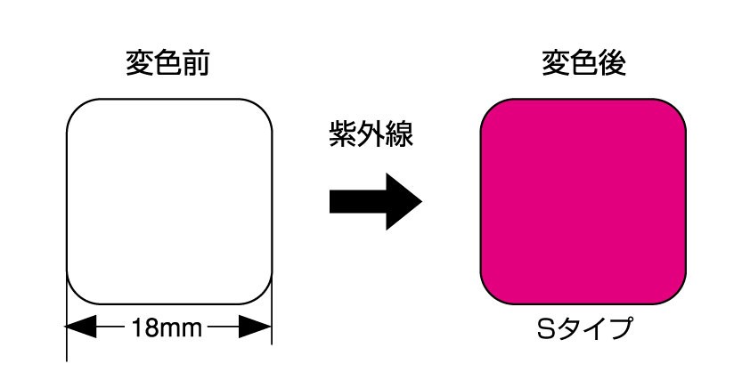 当受到紫外线照射时,颜色由无色变为有色,通过颜色变化可以确认紫外线照射。变色是不可逆的,一旦变色就无法恢复。