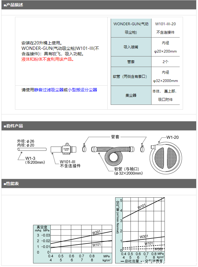 产品简介: 安装在20升桶上使用。 WONDER-GUN(气动吸尘枪)W101-III(不含连接件):具有吹飞,吸入功能。 液体和粉体不宜利用该产品。