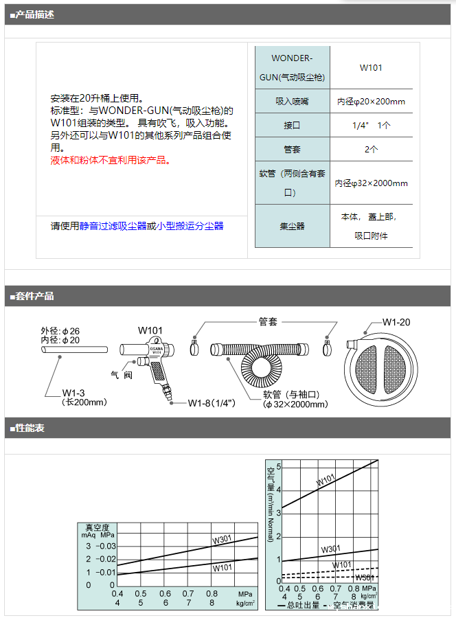 产品简介: 安装在20升桶上使用。 标准型:与WONDER-GUN(气动吸尘枪)的W101组装的类型。 具有吹飞,吸入功能。另外还可以与W101的其他系列产品组合使用。