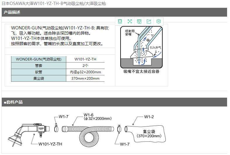 产品简介: WONDER-GUN(气动吸尘枪)W101-YZ-TH-B: 具有吹飞,吸入等功能。适合除去深凹槽内的异物。 W101-YZ-TH本体单独也可使用。 按照顾客的需求,管嘴的长度以及直度加工可更改。