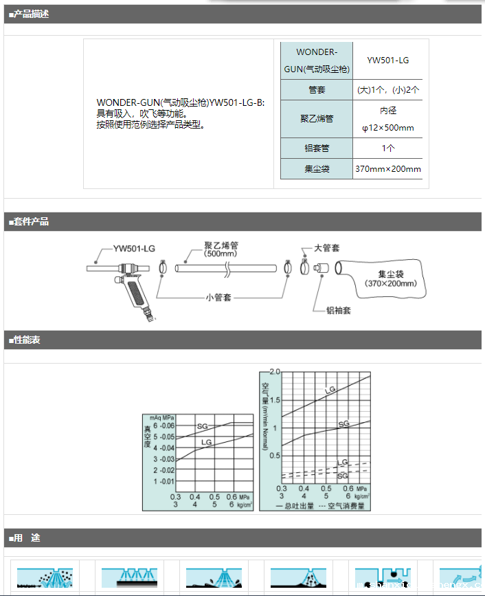 产品简介: WONDER-GUN(气动吸尘枪)YW501-LG-B:具有吸入,吹飞等功能。 按照使用范例选择产品类型。