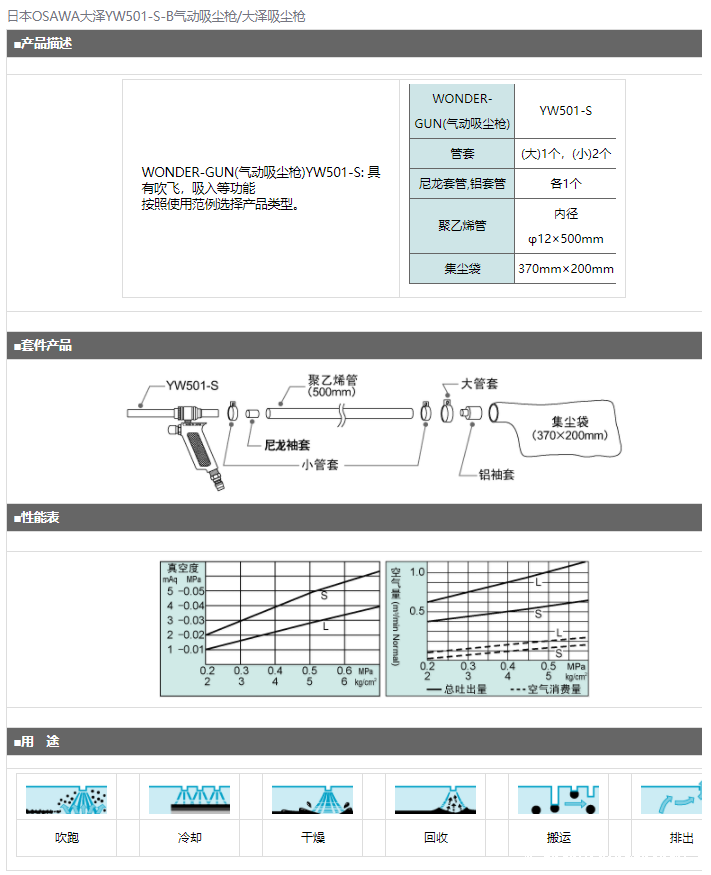 日本OSAWA大泽YW501-S-B气动吸尘枪