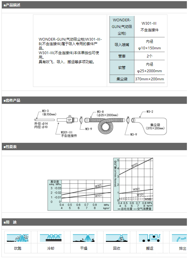 产品简介: WONDER-GUN(气动吸尘枪)W301-III-B(不含连接件)属于吸入专用的套件产品。 W301-III(不含连接件)本体单独也可使用。 具有吹飞,吸入,搬运等多项功能。