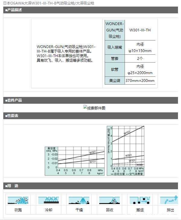 产品简介: WONDER-GUN(气动吸尘枪)W301-III-TH-B属于吸入专用的套件产品。 W301-III-TH本体单独也可使用。 具有吹飞,吸入,搬运等多项功能。