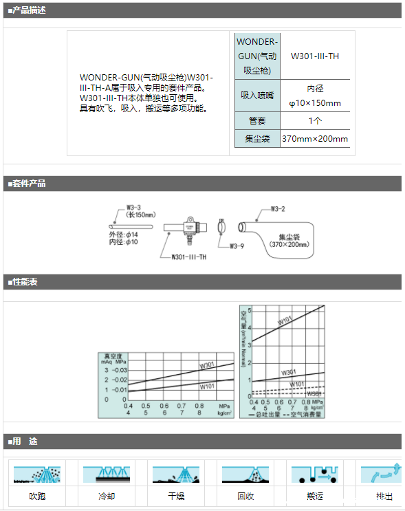 产品简介: WONDER-GUN(气动吸尘枪)W301-III-TH-A属于吸入专用的套件产品。 W301-III-TH本体单独也可使用。 具有吹飞,吸入,搬运等多项功能。