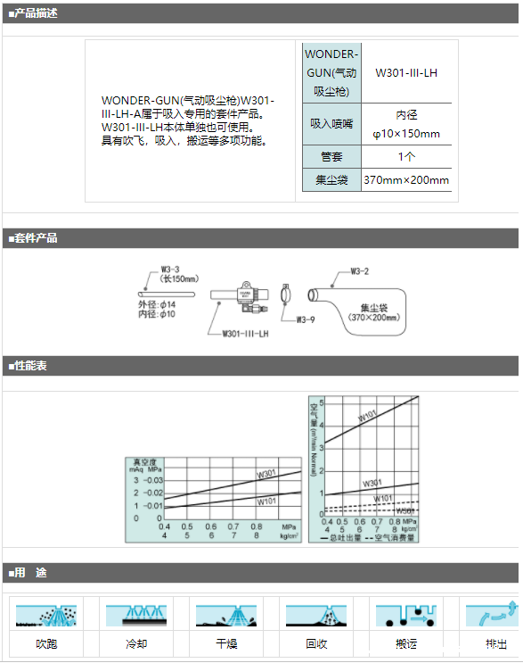 产品简介: WONDER-GUN(气动吸尘枪)W301-III-LH-A属于吸入专用的套件产品。 W301-III-LH本体单独也可使用。 具有吹飞,吸入,搬运等多项功能。