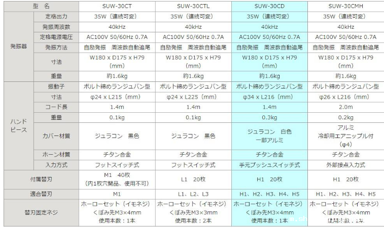 [SUW-30CT/CTL/CD/CMH]是一款超声波切割机,非常适合切割需要美丽切割表面的汽车零件、薄膜、片材、布料、复合材料和塑料。当施加电压时,内置陶瓷振动器开始振动,产生超声波。该超声波被喇叭(振幅放大镜)进一步放大,通过使喇叭尖端的切削工具每秒振动 40,000 次,可以轻松轻松地进行切割。“SUW-30CT/CTL”是对需要双手的工作有效的合身开关类型。“SUW-30CMH”的3种产品阵容展示了其人性化的力量。