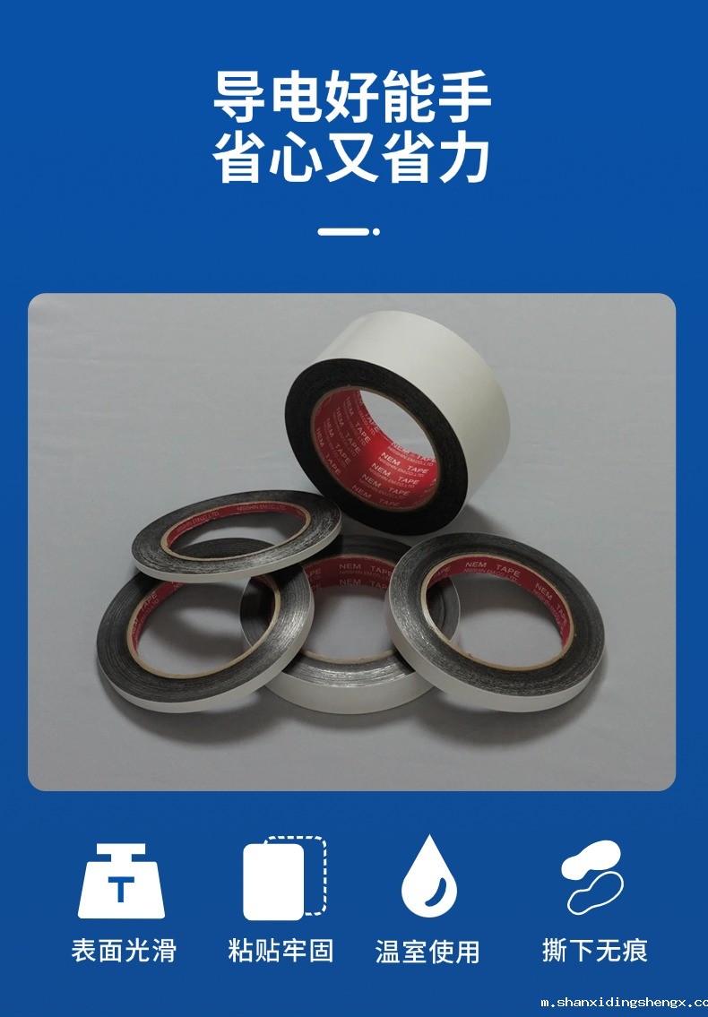 用于密封EMI屏蔽室,壳体和电子设备的接缝,缠绕电缆进行屏蔽,提供可靠的接地表面,对不能焊接的表面提供电接触,日新双面碳导电胶带是专门为扫描电镜具有良好的黏附性和不可辨结构,是观测整个样本的理想背景基片。