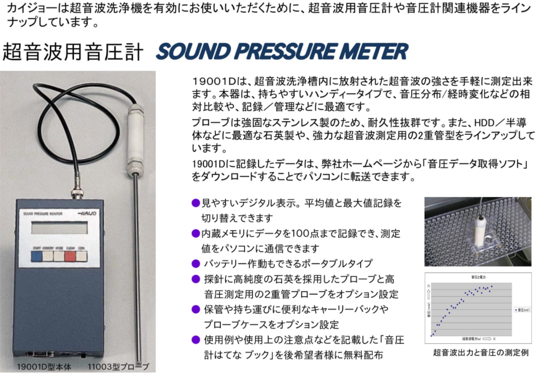 产品简介: 日本KAIJO超声波声压计19001D 产品特点: 易于阅读的数字显示 易于握持的手持型 测量数据可以传送到个人电脑 也可以电池驱动 ​除了不锈钢,石英和高频声压也可作为探头的选项