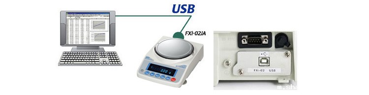 通过使用以太网接口(FXi-08,另售),可以与局域网上的计算机进行双向通信,并且可以将来自多台天平的数据导入一台计算机。