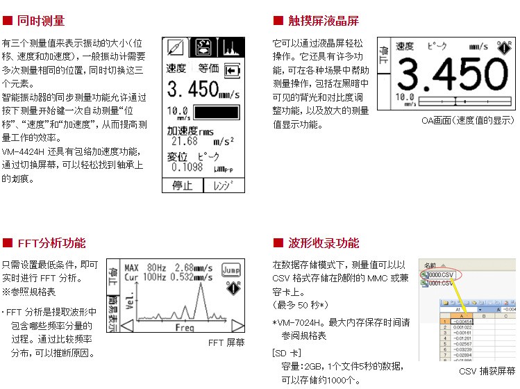 加速度、速度和位移同时显示在触摸屏 LCD 上。加速度、速度、位移OA值同时测量只需按下测量开始键,即可同时自动测量“位移”、“速度”和“加速度”,从而提高测量工作的效率。测量PEAK、RMS、EQP可轻松切换模式。 最大振幅(如冲击波)为 Peak,旋转机器的条件为 rms,可在屏幕上轻松切换。FFT 分析只需设置最低条件,即可实时进行 FFT 分析。波形收录功能(收录到SD卡中)在数据存储模式下,波形数据可以 CSV 格式存储在随附的 SD 卡上。