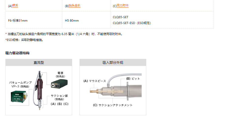 负压吸住螺丝,省去了捡螺丝的麻烦。也可吸附不锈钢等有色金属螺丝,高效作业。也可以去除螺丝拧紧过程中产生的灰尘。订购时订购吸力型时,请分别购买(A)和(B)。如果您想将您现有的螺丝刀改成吸气式,请单独购买(A) (B) (C)。A) 和 (B) 有多种尺寸可供选择,具体取决于所使用的螺钉尺寸。
