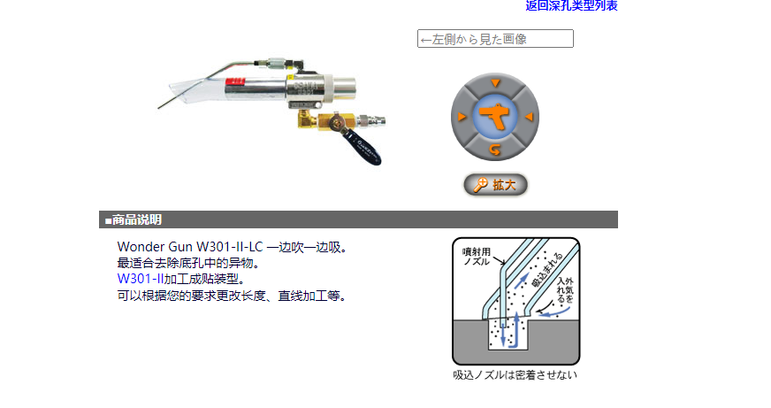 W301-II-LC 一边吹一边吸。适合去除底孔中的异物。W301-II加工成贴装型。可以根据您的要求更改长度、直线加工等。尤其是螺旋喷射式产品,有效利用压缩空气作为动力源,枪内完全呈圆柱形,无障碍物,完全不用担心吸运过程中有物体堵塞内部。通过改变吸嘴的方向,可以在吹气和吸气之间切换,可用于输送、收集、冷却、排气等。产品系列的小内径为 2.8mm 至 75mm。