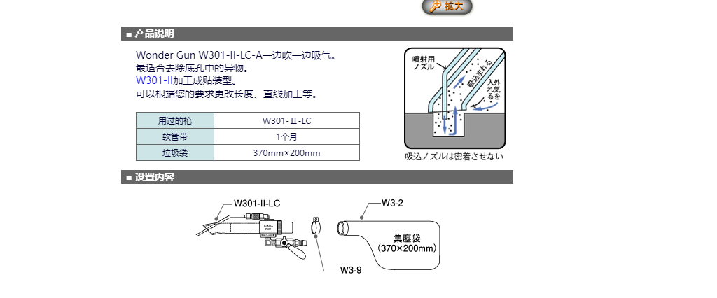 产品简介: Wonder Gun W301-II-LC-A一边吹一边吸气。 最适合去除底孔中的异物。W301-II加工成贴装型。 可以根据您的要求更改长度、直线加工等。 加工成贴装型。可以根据您的要求更改长度、直线加工等。OSAWA泽吸尘枪W301的最小内径小于 W101。与W101一样,它是一款以压缩空气为动力源,可吹、吸、运的独特气枪。 螺旋喷射方式有效利用空气,枪内部为无障碍物的圆柱体,完全不用担心被吸。它是一个最小内径为Φ11的圆柱体,通过改变内部吸嘴的方向,既可用于吹气和吸气,又可用于输送、收集、冷却和排气。此外,枪的形状使其易于握持且易于操作。它可用于广泛的用途,例如清洁切削粉尘和输送颗粒。