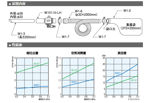 osawa大泽W101-III-B是一套用于抽吸的装置。W101-III(无软管接头)可单独使用。请用它来吹、吸、运。大泽的吹气方向安装吸嘴,压缩空气流动,沿“A”方向呈螺旋状喷出。由于这个动作,大量的外部空气被从“B”吸入并与压缩空气结合,可以喷出大量的空气。在吸入方向安装有吸嘴,压缩空气沿“B”方向呈螺旋状喷射。这个动作从“A”处吸取了大量的外界空气,可用于运输和清洁。