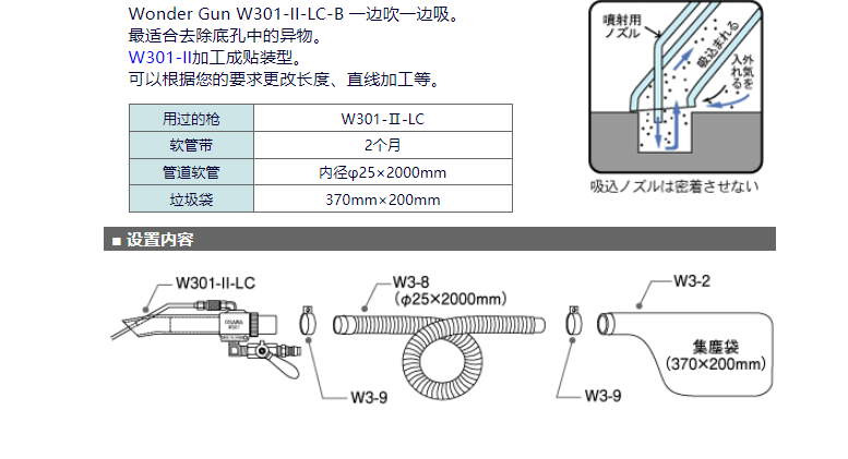 大泽W301-II-LC-B 一边吹一边吸。适合去除底孔中的异物。W301-II加工成贴装型。可以根据您的要求更改长度、直线加工等。我们有多种产品可以满足您的需求,例如可以代替镊子使用的超紧凑型铅笔型,适合从细小区域收集灰尘,以及可以进行全面喷砂的鼓风型.