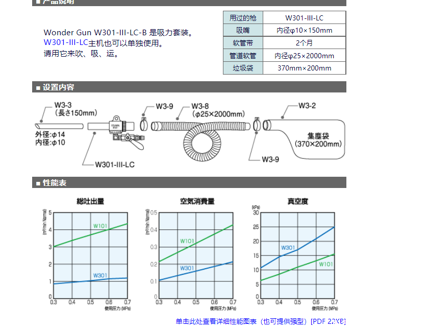 大泽吸尘枪 W301-III-LC-B 是吸力套装。W301-III-LC主机也可以单独使用。请用它来吹、吸、运。尤其是螺旋喷射式产品,有效利用压缩空气作为动力源,枪内完全呈圆柱形,无障碍物,完全不用担心吸运过程中有物体堵塞内部。