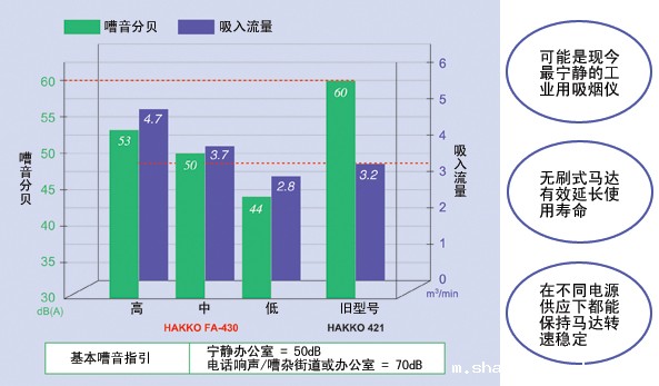 图注: HAKKO FA-430设定在Medium风量时, 吸入流量跟旧型号的相约, 但操作噪音却明显减少。设定在High风量时, 操作噪音也相比起旧型号的少。