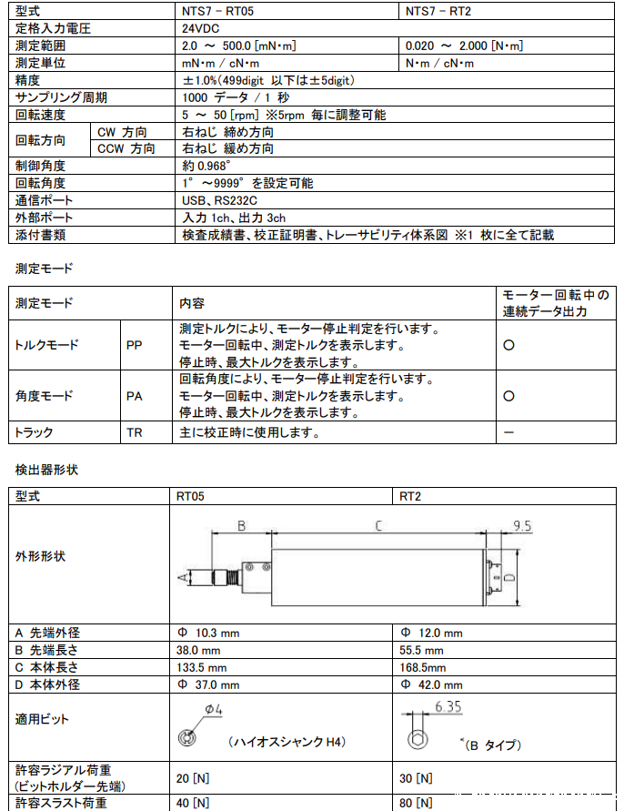 易于理解的彩色 LCD为外部控制准备各种命令转速可选择 5 至 50RPM *以 5RPM 为增量可以用恒定扭矩拧紧与交流电源一起自动打开/关闭2种通讯接口(USB、RS232C)NTS7系列包括NTS7-RT05和NTS7-RT2