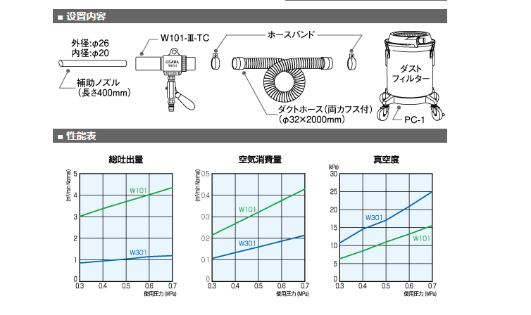W101-III-TC已设置。不能用于液体或粉末。用过的枪W101-III-TC辅助吸嘴内20×400mm软管带2个月管道软管带两个袖口内径φ32×2000mm除尘器PC-1请使用通过连接压缩机的压缩空气,是一款无噪音的吸尘器,可吸水、吸油、小碎石、金属屑等,吸力强劲。由于驱动源是压缩机的压缩空气,因此可以连续运行。此外,所有型号都配备了兼作过滤器的消音器,因此使用时非常安静。还有一种专用吸脂型(用于高粘度液体),可强力收集普通吸尘器难以吸取的油脂。