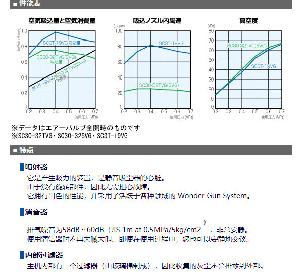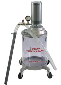 Silent Cleaner SC30-32TVG可以吸入压缩空气(compressor air)作为驱动源。强力收集传统工业清洁剂无法充分收集的高粘度油脂、污泥等。非常适合任何工作场所。2级结构/多重过滤器!长时间连续使用OK!吸力强、降噪的万能吸尘器。重量:13kg 高度:890mm宽度:450mm吸嘴:外径:32mm 长度:600mm吸管:内径:32mm,长度:2000mm25升带脚轮透明罐。
