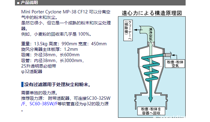 Mini Porter Cyclone MP-38 CF12 可以分离空气中的粉末和灰尘。虽然它很小,但它是一个成熟的粉末和灰尘处理器。例如,小麦粉的回收率几乎是 。重量:13.5kg 高度:990mm 宽度:450mm旋风分离器主体板厚:1.2mm吸嘴:外径38mm,长600mm吸管:内径38mm,长3000mm,25升透明恩必坦带φ32适配器