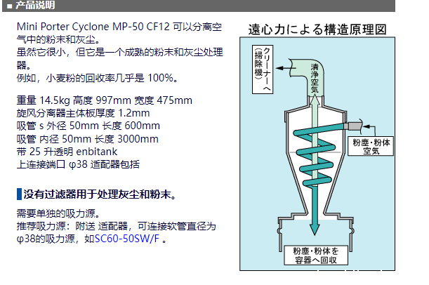 迷你波特旋风分离器 MP-50SWA CF20 可以从空气中分离粉末和灰尘。虽然它很小,但它是一个成熟的粉末和灰尘处理器。例如,小麦粉的回收率几乎是 。吸力生成采用性能的Wonder Gun System。重量20.5kg高度 1,179mm 宽度 437mm Cyclone 机身