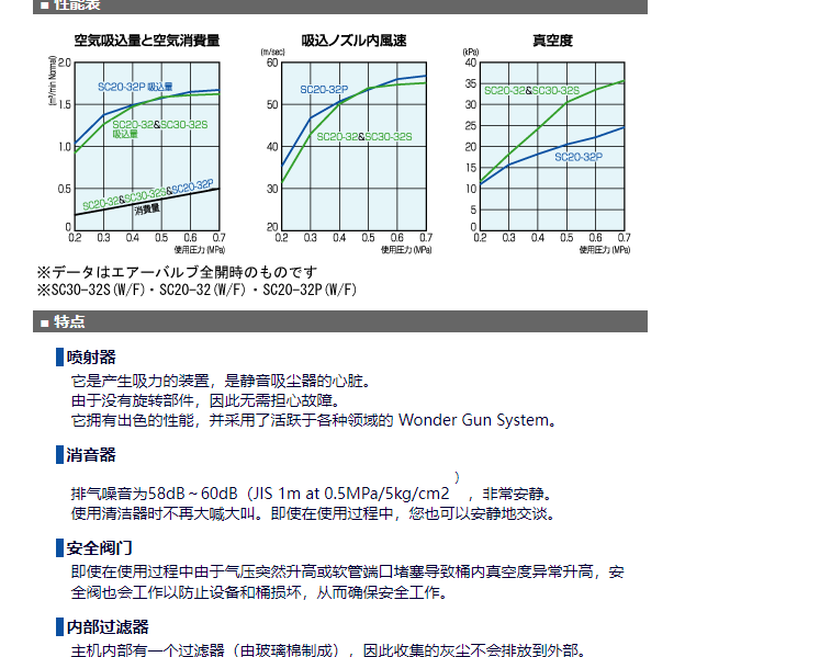 产品简介: Silent Cleaner SC60-32S可以吸入压缩空气(compressor air)作为驱动源。强力收集水、油、污泥、谷物、小砾石、金属碎片等传统工业清洁剂无法充分收集的物质。非常适合任何工作场所。2级结构/多重过滤器!长时间连续使用OK!吸力强、降噪的万能吸尘器。重量:23kg 高度:1,011mm 宽度:550mm吸嘴:外径:32mm 长度:700mm吸管:内径:32mm 长度:2000mm60 升带脚轮的不锈钢罐。也可提供强型。点击此处了解详情