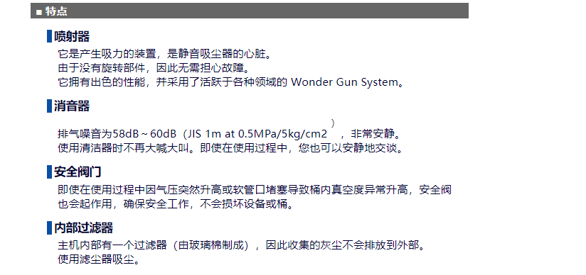 Silent Cleaner SC60-32SG 可以吸入压缩空气(compressor air)作为驱动源。强力收集水、油、污泥、谷物、小砾石、金属碎片等传统工业清洁剂无法充分收集的物质。非常适合任何工作场所。2级结构/多重过滤器!长时间连续使用OK!吸力强、降噪的万能吸尘器。重量:23kg 高度:1,011mm 宽度:550mm吸嘴:外径:32mm 长度:700mm吸管:内径:32mm 长度:2000mm60 升带脚轮的不锈钢罐。也可提供标准型。