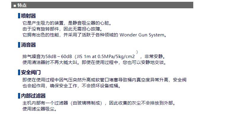 只需将 Silent Cleaner SC200-32DG 放入 200 升开口桶中,即可成为强力清洁剂。可以使用压缩空气(压缩机空气)作为驱动源进行抽吸。强力收集水、油、污泥、谷物、砾石、金属碎片等传统工业清洁剂无法充分收集的物质。非常适合任何工作场所。级结构/多重过器!长时间连续使用OK!吸力强、降噪的吸尘器。重量:12kg 高度:390mm 宽度:600mm吸嘴:外径:32mm 长度:700mm吸管:内径:32mm 长度:2000mm 适用于200 升开口桶。单独准备一个密封容器。(不能使用封闭式桶。)