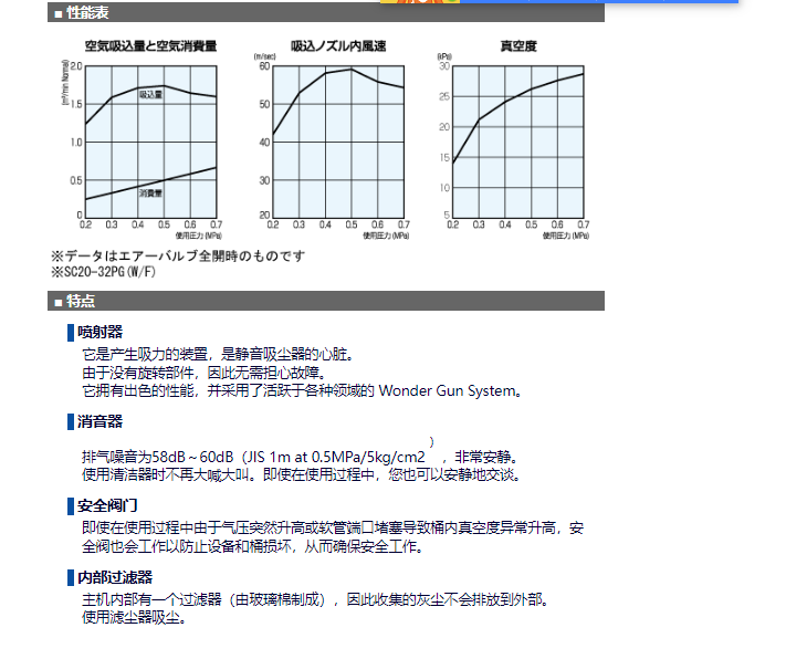产品简介: 静音吸尘器SC20-32PG可以吸入压缩空气(compressor air)作为驱动源。强力收集水、油、污泥、谷物、小砾石、金属碎片等传统工业清洁剂无法充分收集的物质。非常适合任何工作场所。2级结构/多重过滤器!长时间连续使用OK!吸力强、降噪的万能吸尘器。重量 6kg 高度 390mm 宽度 320mm吸嘴:外径 32mm 长度 400mm吸管内径 32mm 长度 2000mm 适用于20 升提桶罐。单独准备一个密封容器。SC20-32G带 20 升油箱,也可提供标准型,