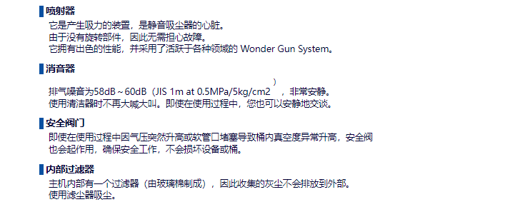 Silent Cleaner SC60-32SG可以吸入压缩空气(compressor air)作为驱动源。强力收集水油、污泥、谷物、小砾石、金属碎片等传统工业清洁剂无法充分收集的物质。非常适合任何工作场所。2级结构/多重过滤器!长时间连续使用OK!吸力强、降噪的吸尘器。