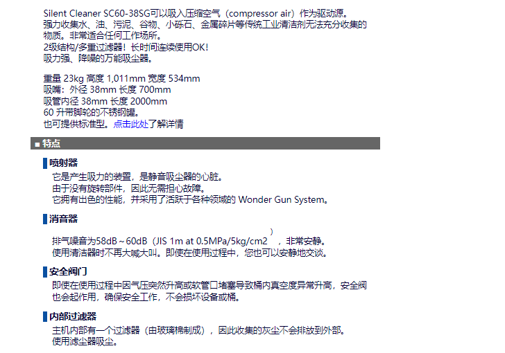 Silent Cleaner SC60-38SG可以吸入压缩空气(compressor air)作为驱动源。强力收集水、油、污泥、谷物、小砾石、金属碎片等传统工业清洁剂无法充分收集的物质。非常适合任何工作场所。2级结构/多重过滤器!长时间连续使用OK!吸力强、降噪的吸尘器。