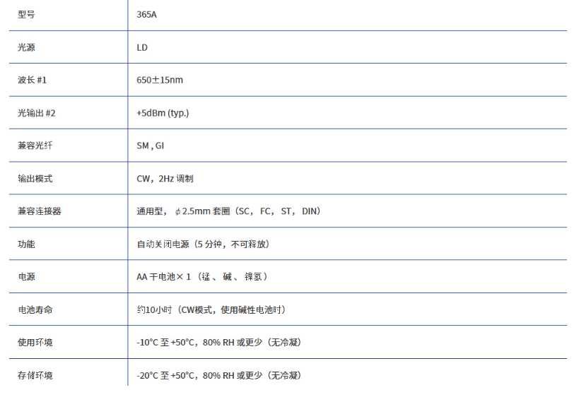端口 850/1310nm 双输出触控调制开关 (CW/2kHz/1kHz/270Hz)轻巧紧凑(名片尺寸)个 AA 干电池可长时间连续运行