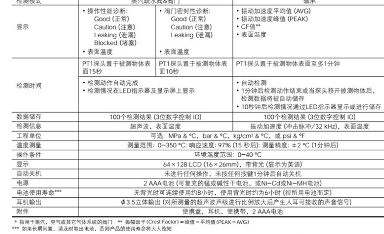 结构紧凑,便于使用。同时测量振动和表面温度。模拟和数字式显示并具备听诊功能,有助于性能检测和判断。快速,准确的蒸汽疏水阀及其它阀门的判断,时间进行必要的维修或更换。听诊检测时分贝值(dB)的显示有助于运作状态的判断。内置滤波器消除环境噪音影响,高频超声波的测量精度高于传统型超声波检测仪。检测仪内部可储存多达100台疏水阀/阀门和100