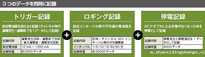 20毫秒的高速采样无输出的报警输出功能-超过设定电流值时的电压触点记录数据可以CSV格式保存在主机内部,可以用附带的软件在PC上显示,触发记录数据也可以在主机显示器上确认