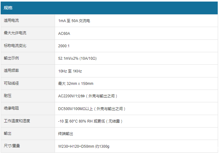 易于安装的分轨型 仅针对漏电流不易受外部影响的高灵敏度型兼容母线布线允许电流 AC60A标称电流变比 2000:1输出示例 52.1mV±2% (10A/10Ω)适用频率 10Hz 至 1KHz可贴线径 32mm x 150mm漏电流不易受外部影响的高灵敏度型兼容母线布线