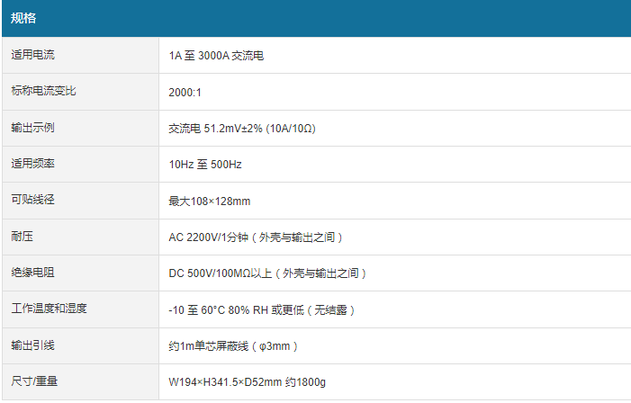 规格适用电流1A 至 3000A 交流电标称电流变比2000:1输出示例交流电 51.2mV±2% (10A/10Ω)适用频率10Hz 至 500Hz可贴线径108×128mm耐压AC 2200V/1分钟(外壳与输出之间)绝缘电阻DC 500V/100MΩ以上(外壳与输出之间)