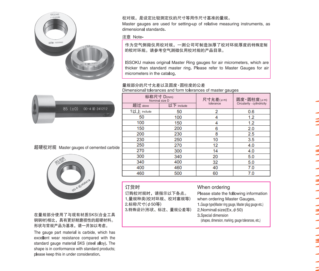 校对规,是设定比较测定仪的尺寸等用作尺寸基准的量规。校对规,是设定比较测定仪的尺寸等用作尺寸基准的量规。Master gauges are used for setting-up of relativemeasuring instruments, asdimensional standards.注意Note-作为空气侧微仪用校对规,一测公司可制造加厚了校对环规厚度的特殊的校对环规。请参考空气测微仪用校对规的产品目录。ISSOKU