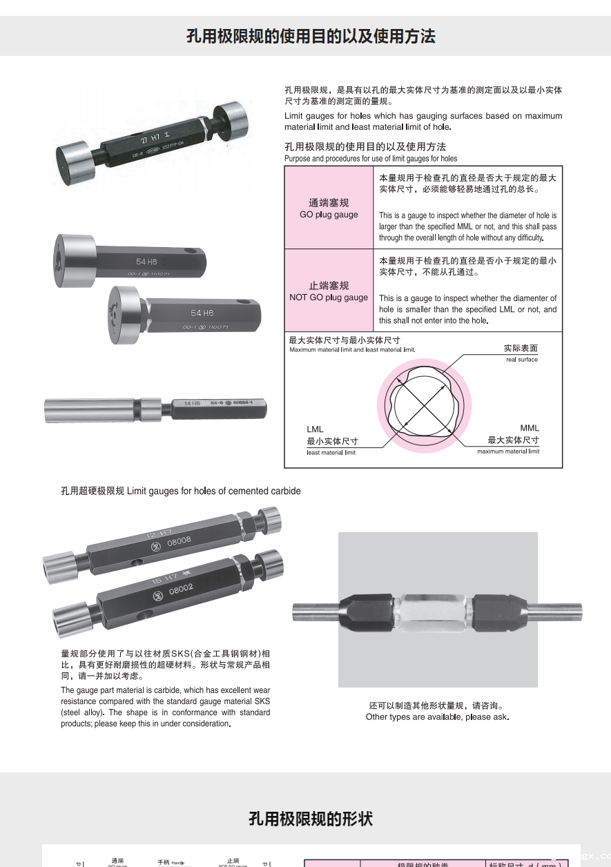 产品简介: 孔用极限规,是具有以孔的最大实体尺寸为基准的测定面以及以最小实体尺寸为基准的测定面的量规。孔用极限规,是具有以孔的最大实体尺寸为基准的测定面以及以最小实体尺寸为基准的测定面的量规。Limit gauges for holes which has gauging surfaces based on maximummaterial limit and least material limit of hole.孔用极限规的使用目的以及使用方法Purpose and procedures for use of limit gauges for holesISSOKU