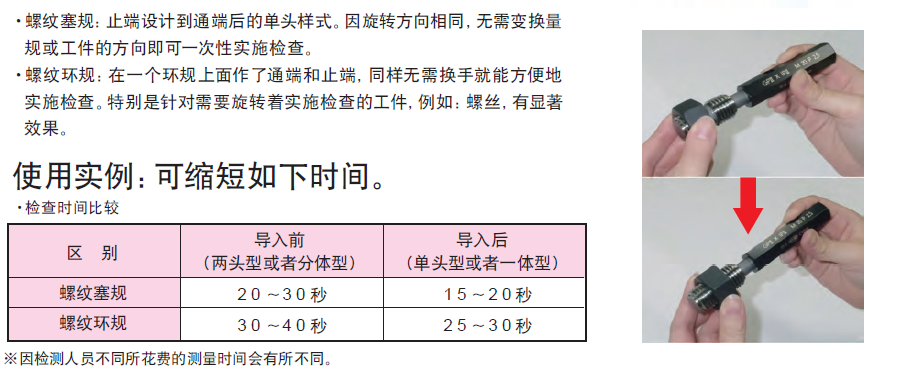 螺纹规-般设计为通端、止端分别在手柄的两侧,或者通端、止端各有一个手柄的单头型。无论是规格,拧入通端后,从通端拔下来,然后变换手势或者变换方向,再用止端检查,都过于花费时间。检查数量多、频度高的时候,不仅花费时间,也会加重检查人员的负担。接检查的话就无法得出正确的判定结果。