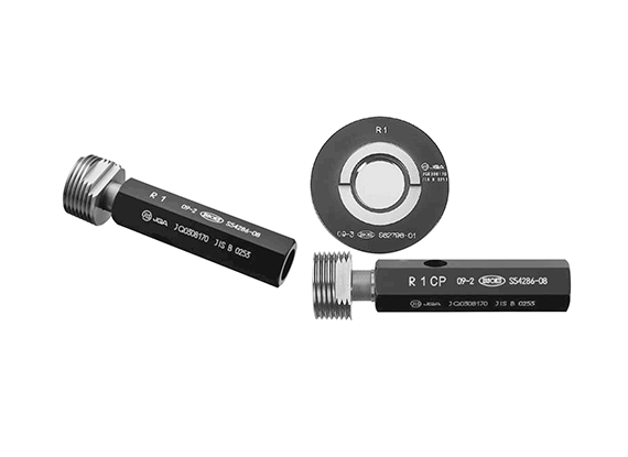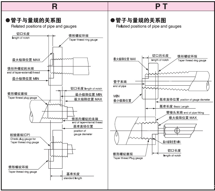 本锥形螺纹量规,用于检查JIS B 0253 规定的R (Rc、Rp)。请注意虽然R和PT产品螺纹为完全相同的尺寸,但是测量方式不同。只要被测螺纹的末端在量规的切口长度范围内,即为合格。主要不同点如下,R螺纹量规的螺纹环规与螺纹塞规相互独立,螺纹环规使用点检塞规(CP)R螺纹量规有磨损极限的规定。被测管或者管接头的端面在量规的切口范围内即为合格。使用注意事项R螺纹量规,可以利用磨损点检规检测环规的磨损极限。PT螺纹量规时,将塞规用于判定产品和检查螺纹环规,当螺纹塞规极端磨损时,将无法检查螺纹环规。产品内螺纹的入口倒角,请勿大于所需尺寸以上,可能会对判定带来不良影响。虽然R螺纹和PT螺纹的尺寸相同,但是所使用量规不同,请勿混用。由于测量方式不同,可能会导致故障。