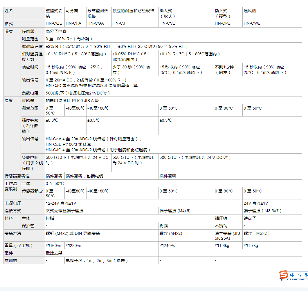 HN-C 系列是一款高性能、高可靠性的 2 线传输温湿度计,使用本公司开发的湿度传感器,具有 0 至 RH 的宽测量范围。有壁挂式、分体式、插入式等多种型号可供选择。另外还有可在-40~180℃的环境下使用的分离型耐热规格,由于它是电容式传感器,因此可以测量 0 到 RH 的相对湿度。根据用途有7种类型:壁挂式、插入式(软式、硬式)、分离式、分离式耐热型、分离式耐压耐热型、通风型。独立的耐热传感器单元可在 -40 至 180°C 的宽范围内使用。传感器部分为完全兼容型,维护简单。还提供具有 Pt100(3 线)温度输出的型号。