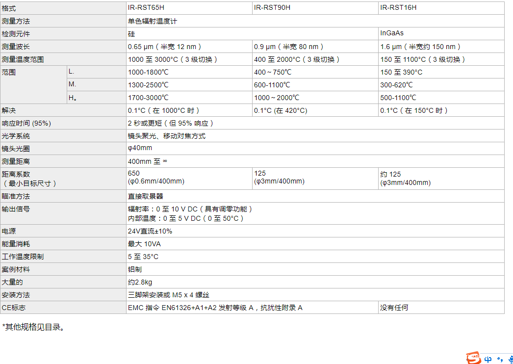 IR-RST 是一种单色辐射温度计,用作使用比较黑体炉对辐射温度计进行比较校准的标准。格式 IR-RST65H IR-RST90H IR-RST16H测量方法 单色辐射温度计检测元件 硅 InGaAs测量波长 0.65 μm(半宽 12 nm) 0.9 μm(半宽 80 nm) 1.6 μm(半宽约150 nm)测量温度范围 1000 至 3000°C(3 级切换) 400 至 2000°C(3 级切换) 150 至 1100°C(3 级切换)范围 L. 1000-1800℃ 400~750℃ 150 至 390°CM. 1300-2500℃ 600-1100℃ 300-620℃