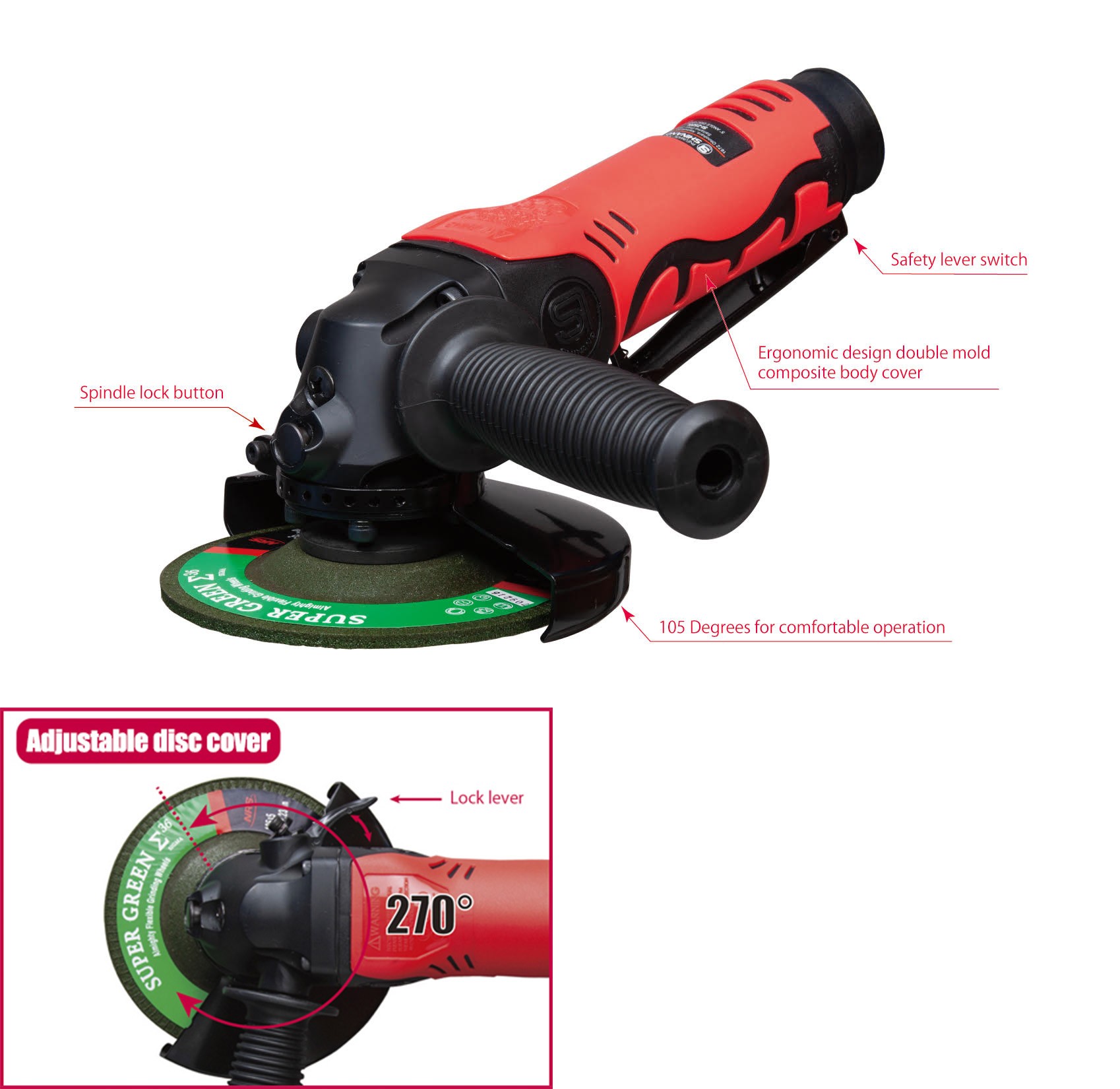 圆盘磨床带安全杆节流阀和14mm螺纹主轴。调速器确保操作安全。主轴锁定按钮可快速更换圆盘,圆盘盖易于改变圆盘盖位置。105度操作舒适。即使长时间工作,复合材料外壳也能防止手冰凉。