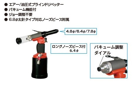 产品规格产品规格能力 4.8φ/6.4φ/7.8φ中风 22.5毫米全长 305mm高度 310mm大量的 1.88公斤耗气量 1.8ℓ/铆钉使用的压缩机 2.2KW使用软管的内径 6.5毫米