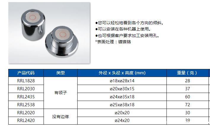 您可以轻松地看到各个方向的倾斜,可以安装在各种机器上使用。也可根据客户要求加工安装用孔。表面处理:镀镍铬