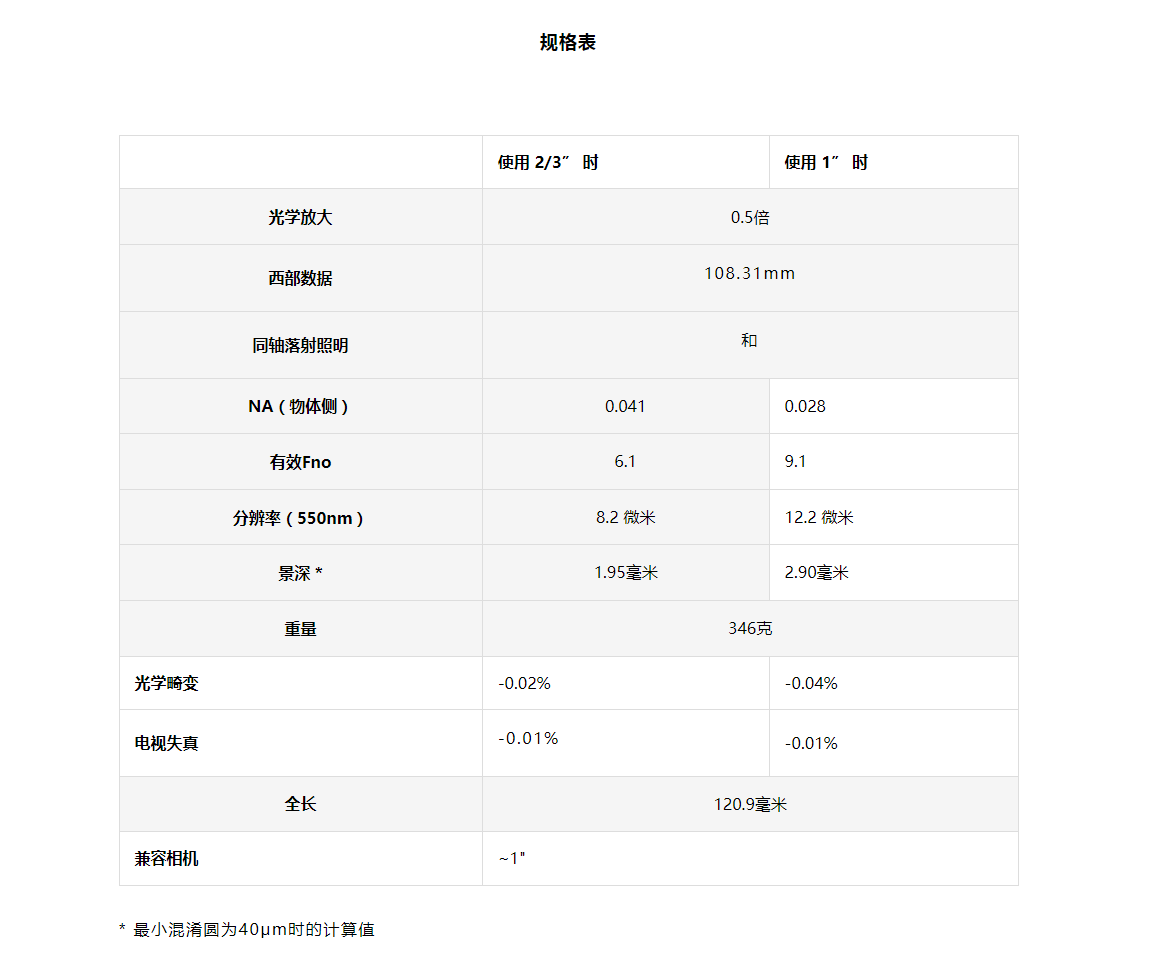 108.31mm,同轴落射照明和,NA(物体侧) 0.041 0.028,有效Fno 6.1 9.1分辨率(550nm) 8.2 微米 12.2 微米,景深 * 1.95毫米 2.90毫米,重量 346克光学畸变 -0.02% -0.04%电视失真 -0.01%-0.01%全长 120.9毫米兼容相机 ~1"