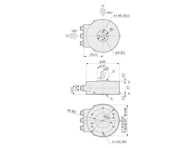 是使用了应变片,可测量X,Y,Z的3方向力的分力传感器。额定容量:±10~±500N直径:88mm非线性:±0.5%RO或以内特点